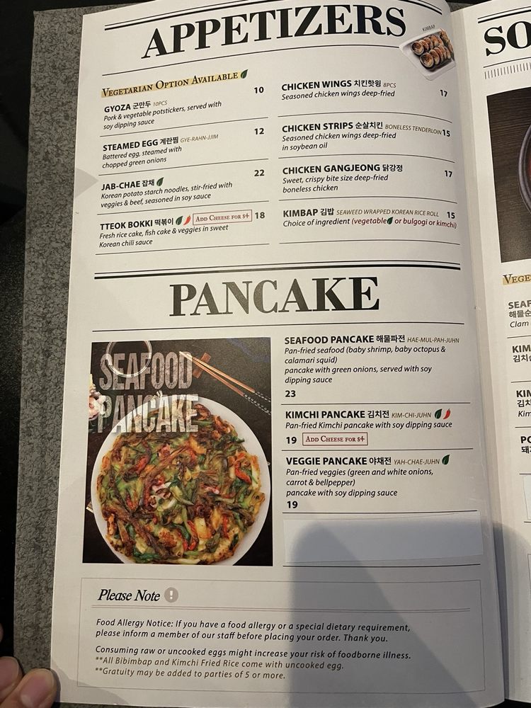 Pan-fried seafood (baby shrimp, baby octopus, and calamari squid) pancake with green onions. Served with soy dipping sauce.